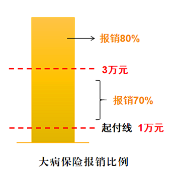 大病保险实行分段报销,目前大病保险起付线为1万元,在一个医保年度内符合保障范围内的费用,累计1万元以上3万元以下部分可报销70%;超过3万元以上部分报销80%。