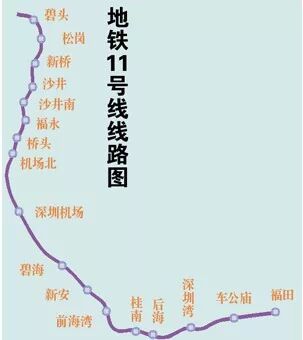 深圳地铁11号线全程线路站点:福田---车公庙---深圳湾公园---后海---桂庙---前海湾---新安---碧海---深圳机场---机场北---桥头---福永---沙井南---沙井---新桥---松岗---碧头(17站)