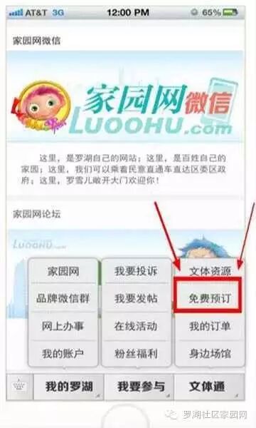 【方式二】在公众号最下方导航栏中,选择栏目“文体通”-“免费预订”,参与罗湖体育休闲公园免费项目的预订啦!