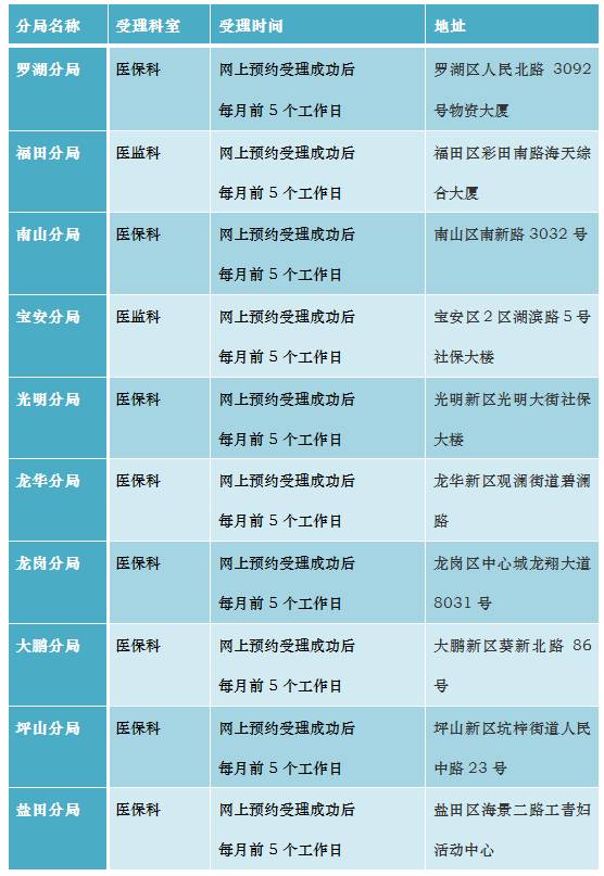 各社保分局每月首5个工作日现场办理辖区内申请确认深圳市社会医疗保险定点医疗机构、定点零售药店业务,申报单位根据预约情况到所属社保分局提交申报材料。