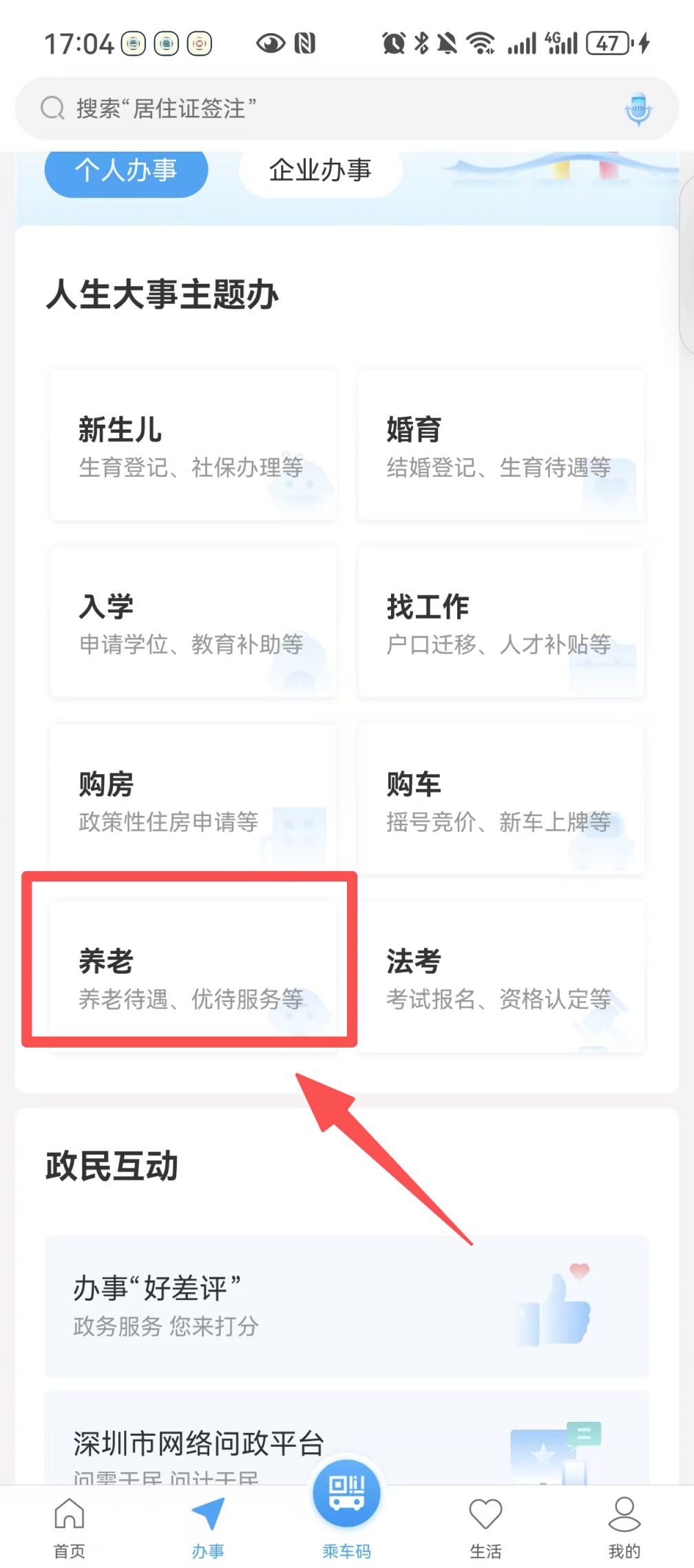 登录成功后,点击下方【办事】栏目,在人生大事主题办版块点击【养老】;