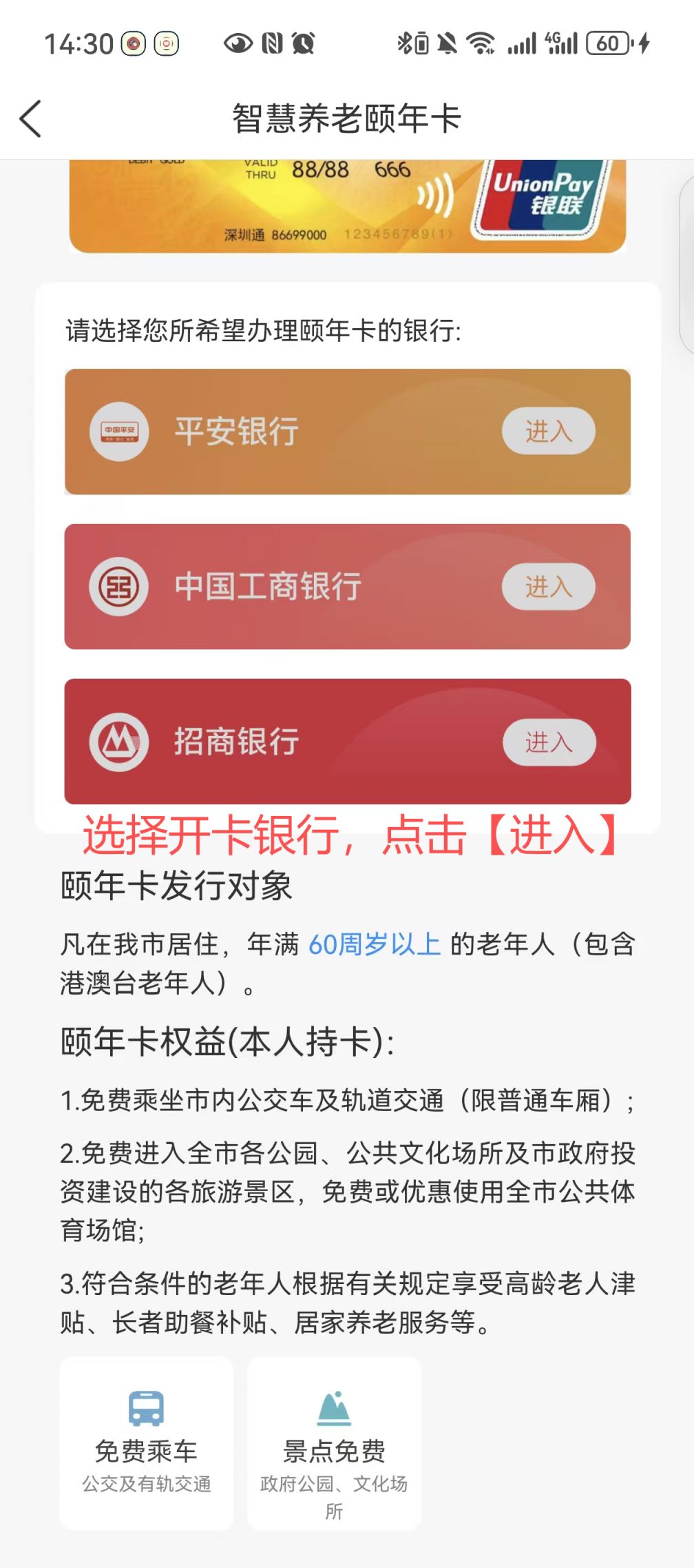 点击【智慧养老颐年卡】进入申办入口,选择开卡银行,点击对应一栏的【进入】,进入对应银行申办页面,线上填报开卡资料,上传身份证信息,然后提交开卡申请。选择邮寄领卡的老年人,颐年卡会免费邮寄到家。老年人收到卡后,按照用卡指引进行预约,在预约时间持颐年卡、身份证和手机,前往合作办卡银行深圳营业网点办理颐年卡激活。