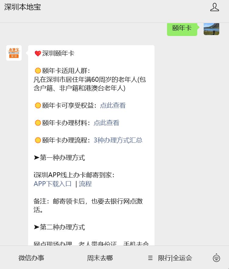 温馨提示:微信搜索公众号【深圳本地宝】,关注后在对话框回复【颐年卡】可获深圳颐年卡办理入口、办理条件和需要准备的材料、办理流程图示、享受的优惠等内容