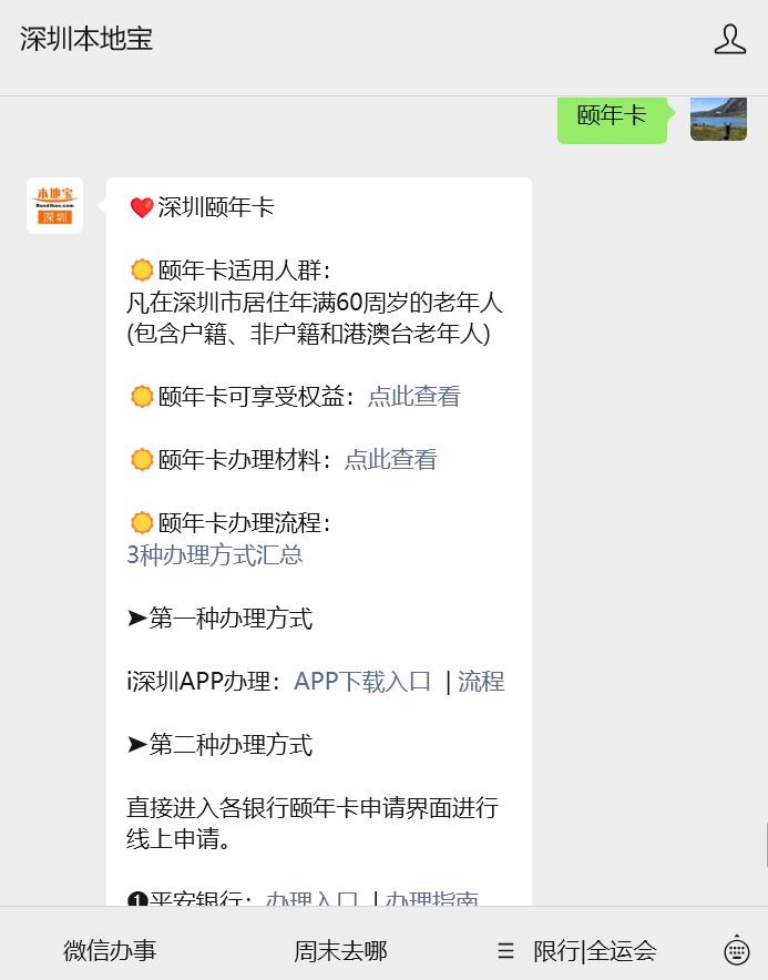 温馨提示:微信搜索公众号【深圳本地宝】,关注后在对话框回复【颐年卡】可获深圳颐年卡办理入口、办理条件和需要准备的材料、办理流程图示、享受的优惠等内容