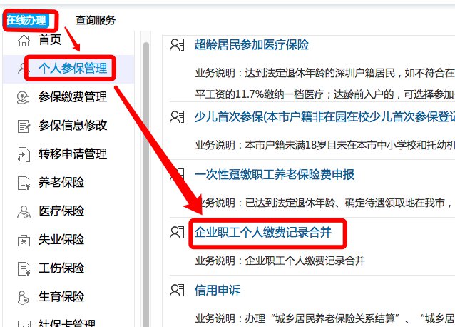 深圳居民进入深圳社保局官网,个人服务网页——在线办理——个人参保管理——企业职工个人缴费记录合并,录入信息后按照要求上传审核材料。