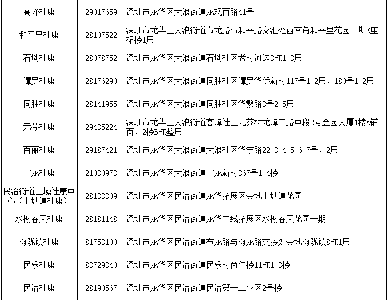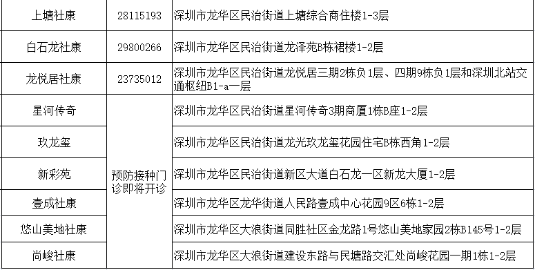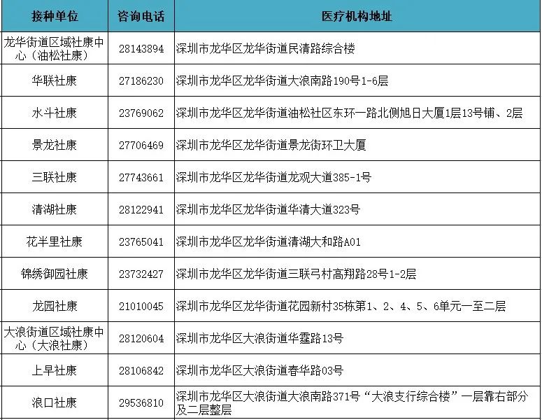 深圳龙华区人民医院社康中心新冠疫苗接种门诊一览表