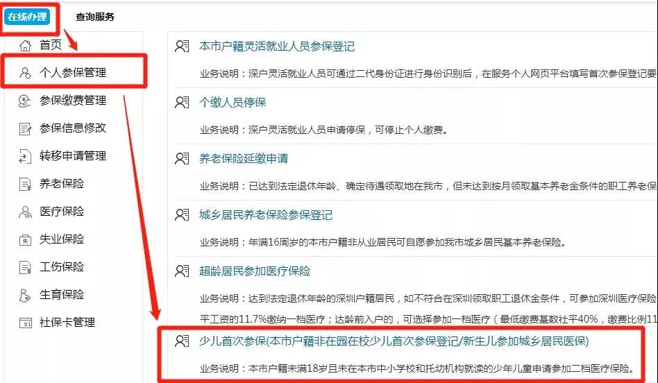 1.关注“深圳医保”微信公众号,菜单栏选择“掌上政务”→“个人业务办理”→“少儿参保管理”→“少儿参保登记/恢复(非在园在校少儿)”,输入参保少儿及监护人信息,进行参保登记。
