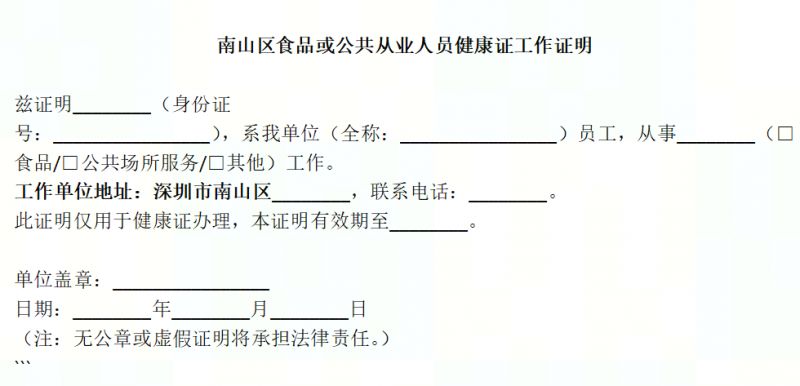南山区单位职工可持南山区单位工作证明和身份证前往深圳市前海蛇口自贸区医院、南方科技大学医院、南山区妇幼保健院免费办理健康证。