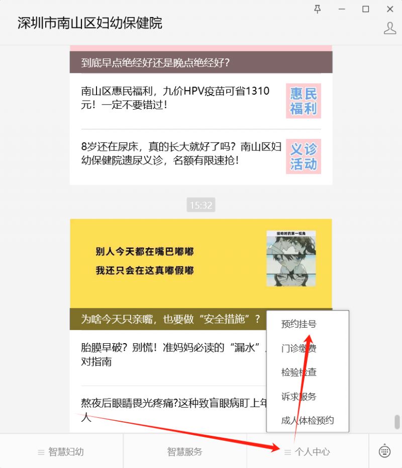 例如南山区婚检预约——“深圳市南山区妇幼保健院”公众号预约: