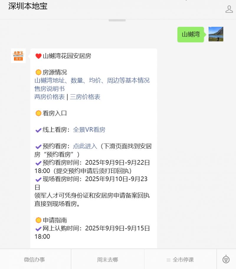 温馨提示:微信搜索公众号【深圳本地宝】,关注后回复【山樾湾】可获深圳山樾湾安居房地址及交通、两房/三房价格、户型图及售房说明书、预计交付时间和装修交付标准、vr在线看房及现场看房预约、在线申请房源及查询排名等