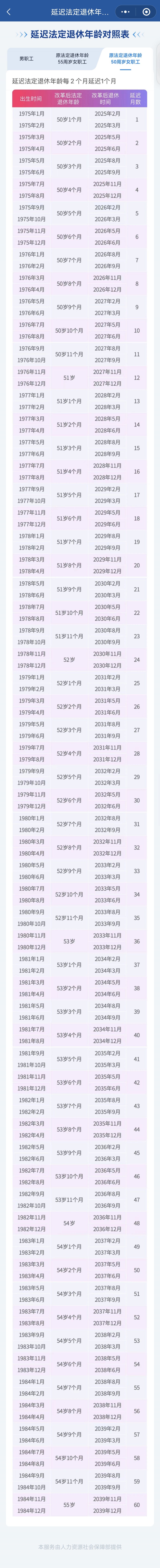 可通过右侧文章或下图查看延迟退休年龄对照表(男职工+女职工):