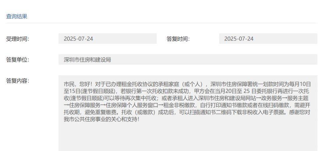 对于已办理租金托收协议的承租家庭(或个人),深圳市住房保障署统一划款时间为每月10日至15日(逢节假日顺延),若银行第一次托收扣款未成功,甲方会在当月20日至 25 日委托银行再进行一次托收(逢节假日顺延)可以等待再次集中托收;或者承租人进入深圳市住房和建设局网站→政务服务→服务主题→住房保障服务(https://zjj.sz.gov.cn/ztfw/zfbz/?from=index)→住房保障个人服务窗口→租金非税缴款,自行打印通知书缴款或者在线扫码缴款,需避开托收期,避免重复缴费。托收(或缴款)成功后,可以扫描通知书二维码下载非税收入电子票据。
