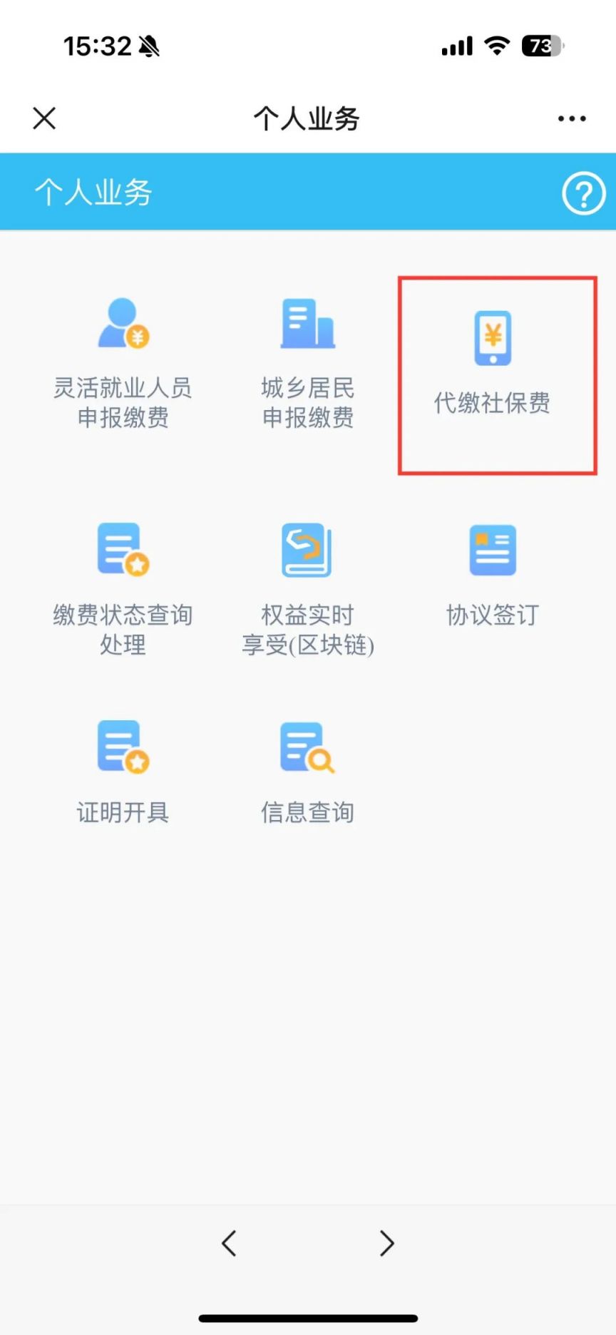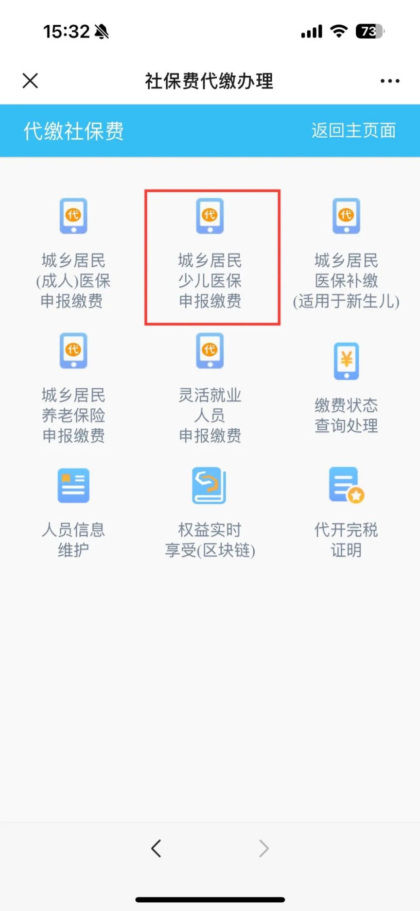 步骤二,选择“我要办”→“社保缴费”→输入监护人姓名、证件号码通过短信验证完成登录→点击【代缴社保费】→选择【城乡居民少儿医保申报缴费】→输入少儿姓名、证件号码一确认申报缴费信息→完成缴费。