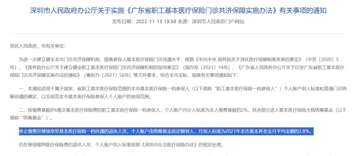 根据《深圳市人民政府办公厅关于实施<广东省职工基本医疗保险门诊共济保障实施办法>有关事项的通知》(深府办函〔2022〕117号)有关规定,停止缴费并继续享受基本医疗保险一档待遇的退休人员,个人账户由统筹基金按定额划入,月划入标准为2021年本市基本养老金月平均金额的2.8%。