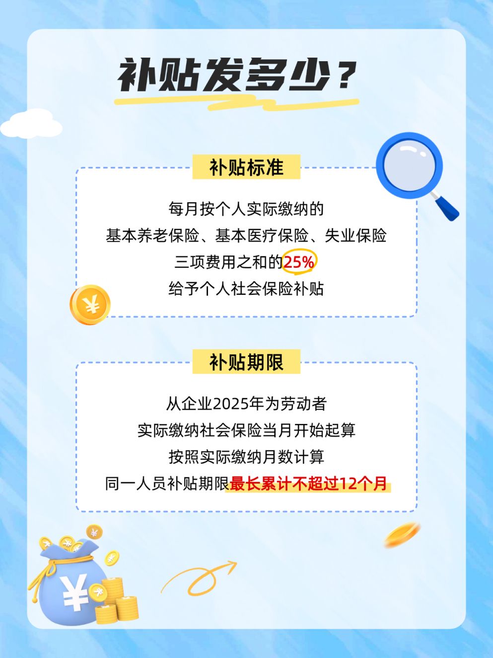 假如你每月缴纳这三险的费用是800元,那么每月补贴金额为800×25%=200元。最多可补贴12个月也就是2400元。
