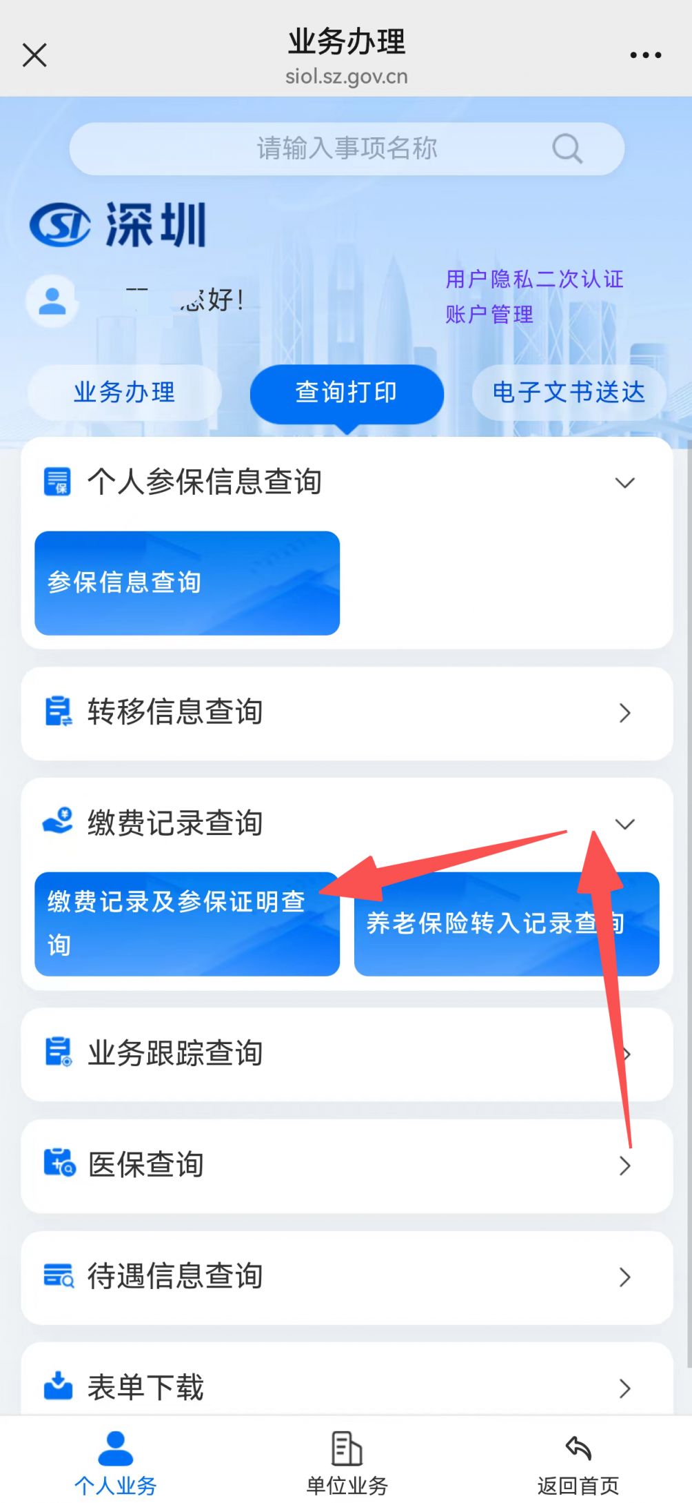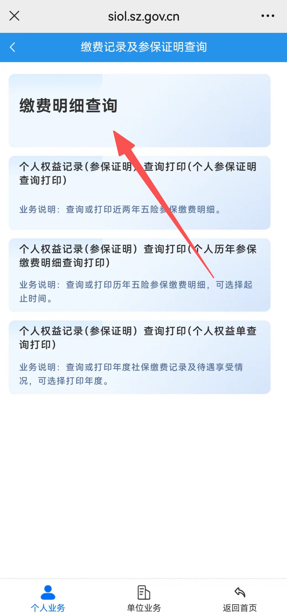 点击【缴费记录查询】—【缴费明细查询】,可以查询五险每月自己交多少钱、公司交多少钱、个账每月划入金额、近两年参保证明以及历年参保缴费明细