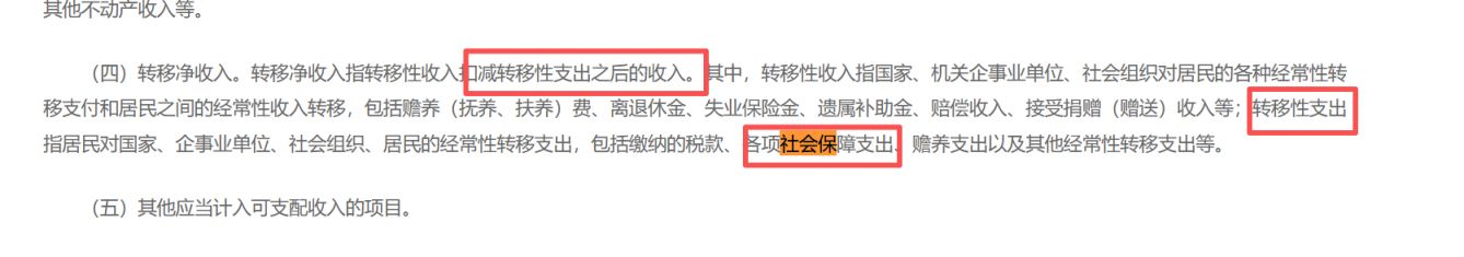 其中转移净收入指转移性收入扣减转移性支出之后的收入。其中,转移性收入指国家、机关企事业单位、社会组织对居民的各种经常性转移支付和居民之间的经常性收入转移,包括赡养(抚养、扶养)费、离退休金、失业保险金、遗属补助金、赔偿收入、接受捐赠(赠送)收入等;转移性支出指居民对国家、企事业单位、社会组织、居民的经常性转移支出,包括缴纳的税款、各项社会保障支出、赡养支出以及其他经常性转移支出等。