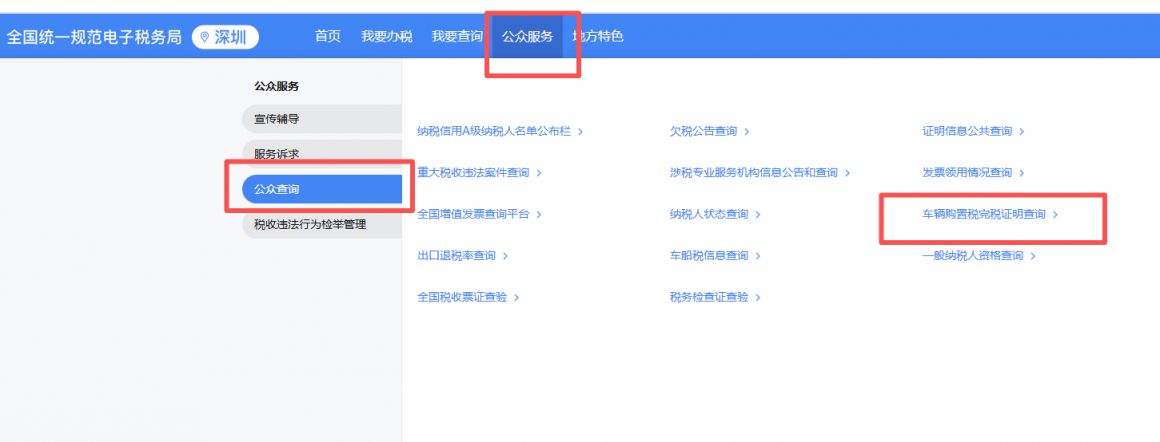 第二步:登录新电子税局,依次点击【公众服务】—【公众查询】—【车辆购置税完税证明查询】。
