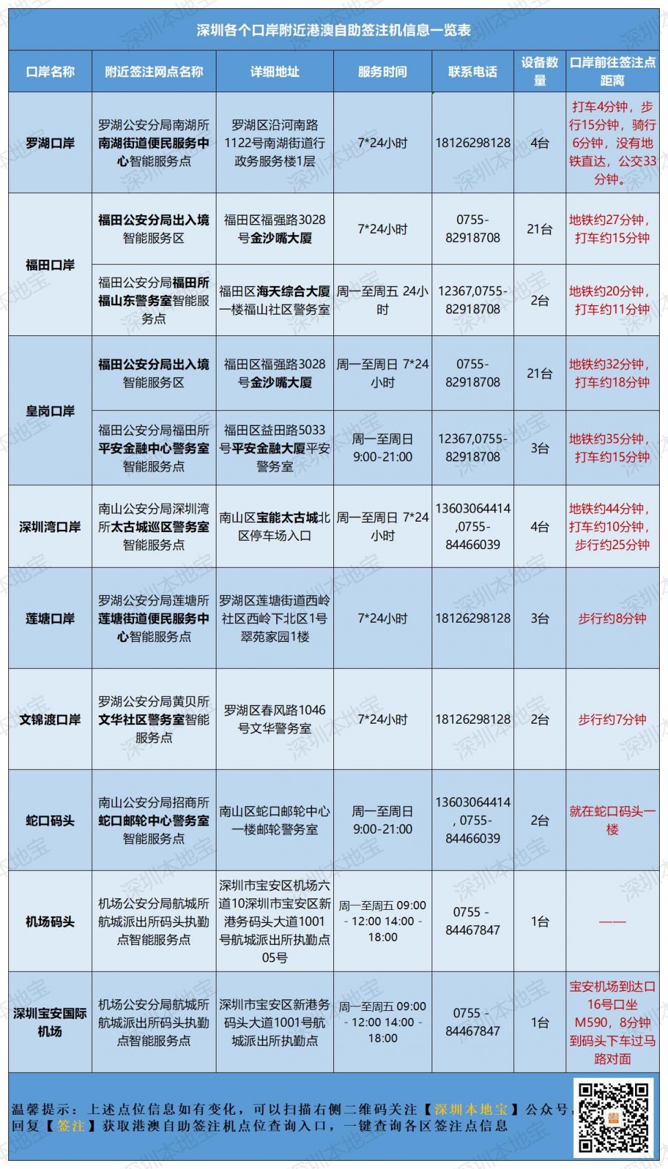 温馨提示:微信搜索并关注【深圳本地宝】,在对话框回复【口岸】获取深圳口岸开放时间、地址及交通指引、福田/罗湖/深圳湾口岸等通关攻略、停车场收费标准及预约停车入口等