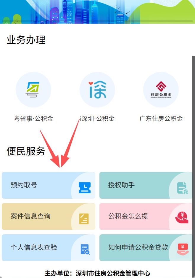 或者微信搜索进入“深圳市公积金”官方公众号——菜单栏中的【业务办理】—【公积金预约取号】—然后进入【预约申请】页面;
