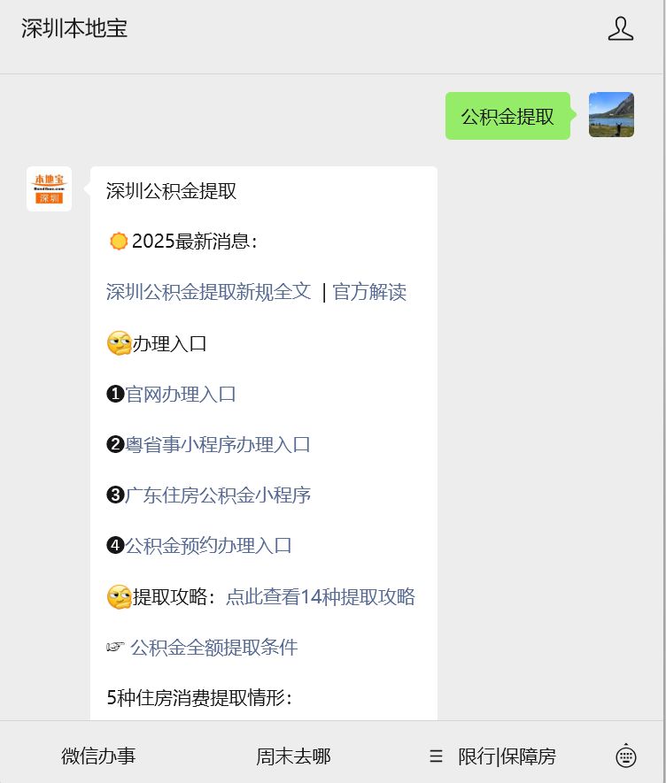 温馨提示:微信搜索公众号【深圳本地宝】,关注后在对话框回复【公积金提取】可获取深圳公积金提取入口,公积金提取全攻略,哪些情况可以全额提取,租房/买房怎么提取,买房首付怎么提取,提取到账时间、公积金账户余额和线下办理网点查询入口等