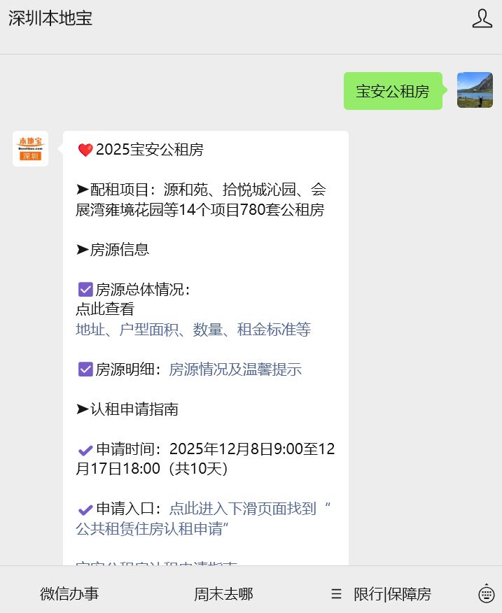 温馨提示:微信搜索公众号【深圳本地宝】,关注后在对话框回复【宝安公租房】可获宝安公租房最新配租房源地址、租金价格、房源明细及温馨提示、认租申请入口、申请指南、收入财产核对指引、区排名查询入口等!