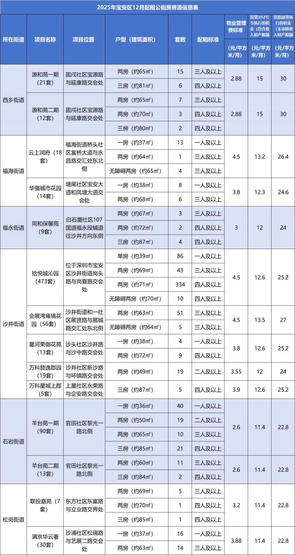 宝安区住建局面向宝安区户籍公租房轮候家庭配租780套公租房,涵盖西乡、福永、福海、沙井、石岩、松岗街道的14个项目。认租时间为2025年12月8日9:00至12月17日18:00(共10天)。