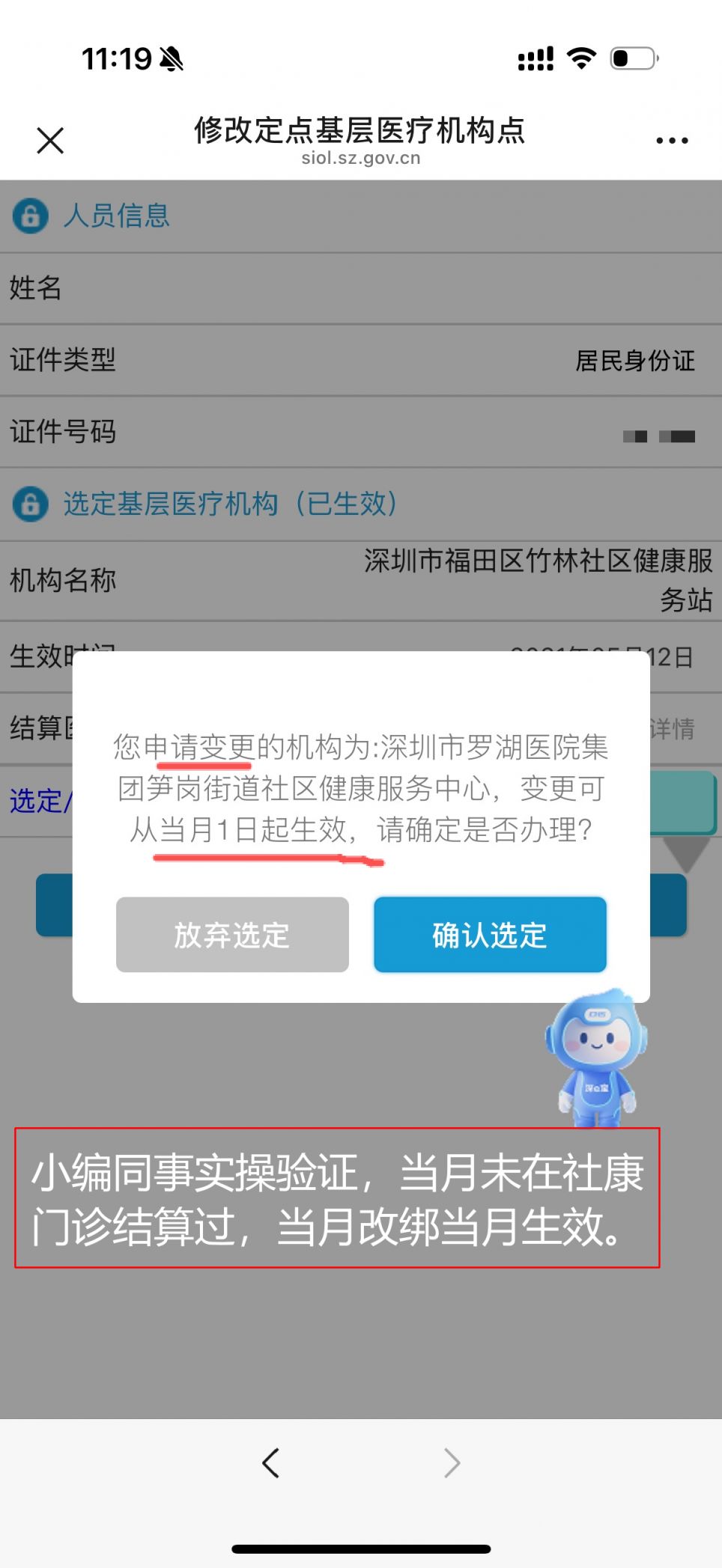 参保人变更当月在选定的基层医疗机构(含结算机构及下设社康)进行了门诊结算并享受医保待遇的,变更自选定次月1日起生效。