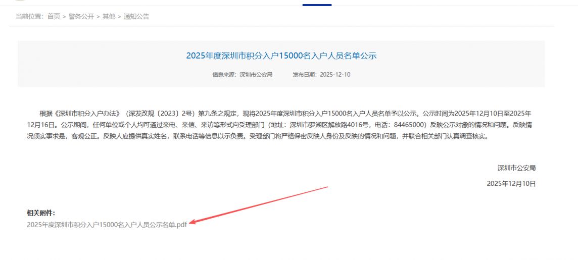 根据《深圳市积分入户办法》(深发改规〔2023〕2号)第九条之规定,现将2025年度深圳市积分入户15000名入户人员名单予以公示。公示时间为2025年12月10日至2025年12月16日。公示名单查询入口:https://ga.sz.gov.cn/ZWGK/QT/GSGG/content/post_12540534.html