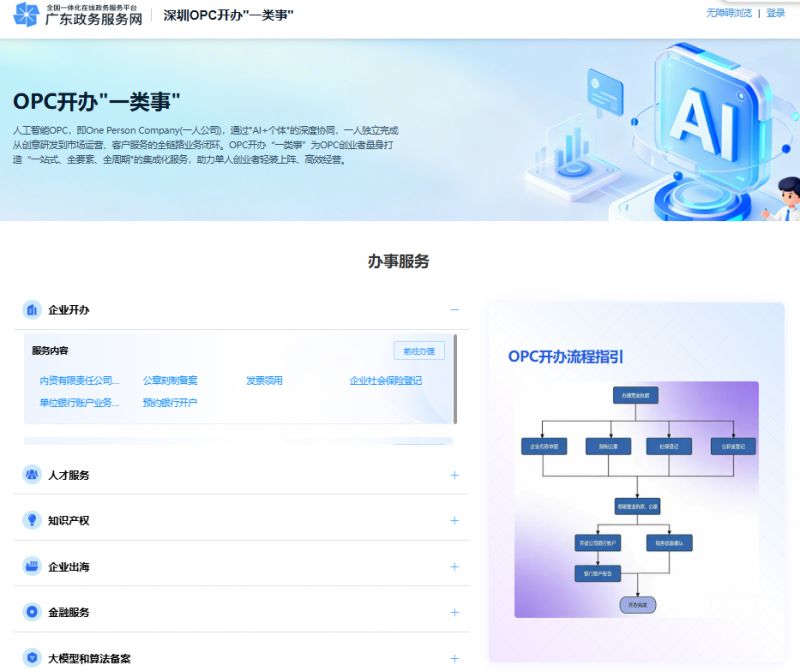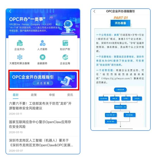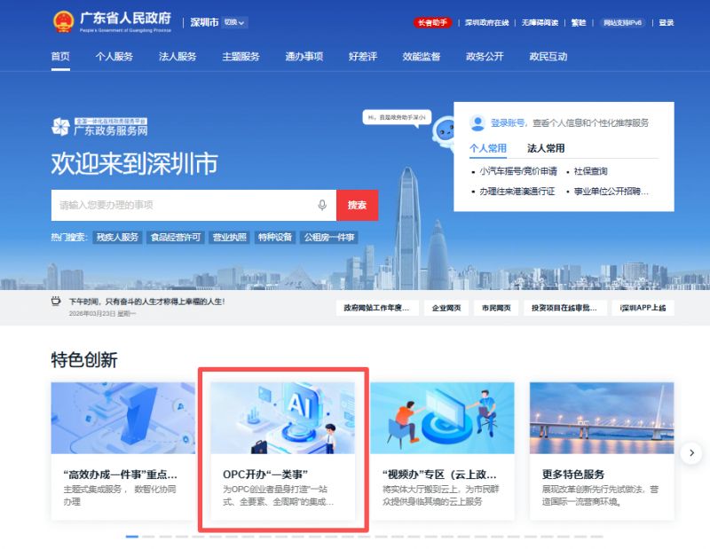 2026年3月23日“i深圳”APP(直接在手机应用市场内下载)与广东政务服务网(深圳站)上线【OPC开办“一类事”】专区,为深圳AI创业生态建设提供政务服务支撑。