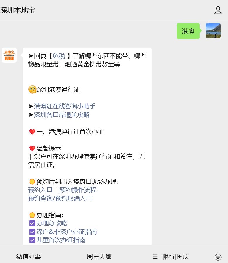 市民可在深圳公安公众号(点击打开链接),选择【出入境业务】→【中国公民服务】→【往来港澳通行证及签注】→【办理往来港澳通行证团队游签注】或【办理往来港澳通行证个人游签注】选哪个都行→【发起预约】,预约现场出入境大厅办理港澳通行证,但是一定要记住先预约哦!(预约地点只要有号能预约就行,不用考虑区域问题)